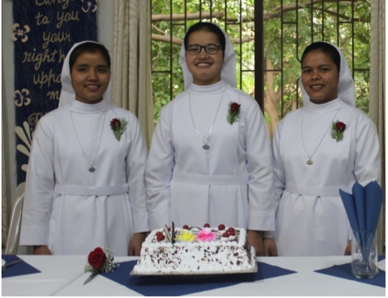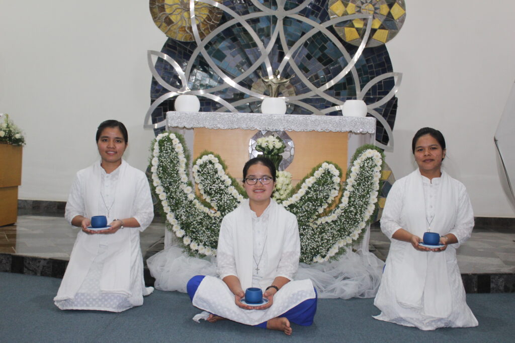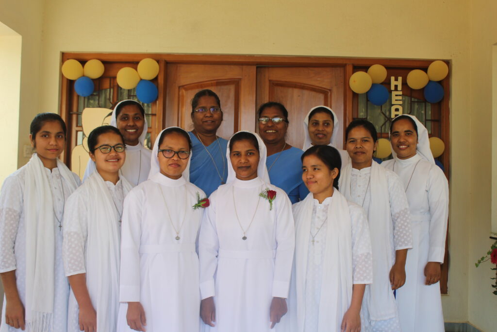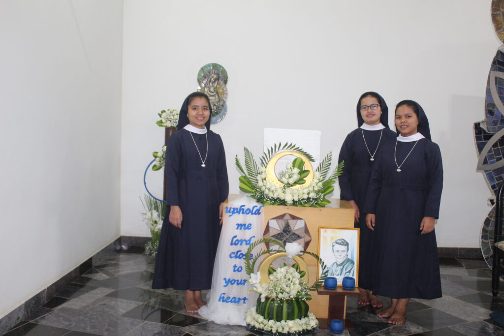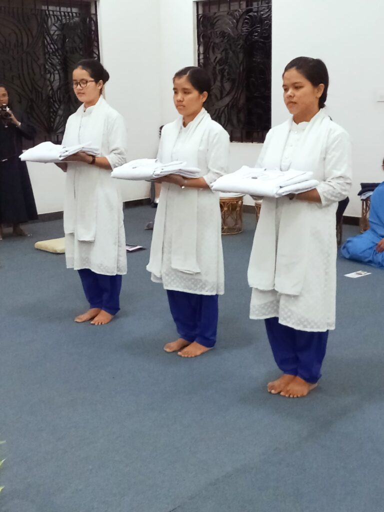 On July 21, 2024, novices Dona Mary Rynjah, Pynkmenlang Sohtun, and Risfina Kharwanniang made their first profession at the Sarupya Novitiate in Bangalore. Sr. Grace Mary Cherian, SDS, the Regional Superior, received their vows during the solemn Holy Eucharist. Fr. Sebastian Cheeramvelil SDS, presided over the service, with Fr. Vijoy MSFS, and Fr. Varaprasad, SDS, concelebrating the Mass along with almost 30 priests and many number of religious Sisters from neighboring communities.